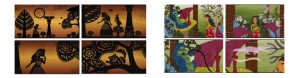 While defining composition for the animation of each art form the decision-making is done through various parameters. This includes the total number of characters and elements on screen, the existing elements to be picked from the particular art form and whether there is need to add new elements as per story requirement which are non-existing in the original art form. The shadow puppetry in its original performance uses a small number of characters and elements on stage at a time due to the limited number of people performing it. But that constraint doesn’t exist while adapting it in an animation form. So, a need for extra elements/characters arises to create the ambience and fill the empty spaces. Some of the existing elements used in original performances like trees and pillars are directly picked for the animation while new elements like mushrooms, grass, clouds and birds are added as per the need of story. As implied, we deviated at ‘Medium’ level of variance during this practice by introducing few additional elements on top of the actual practice to balance the composition by filling the unnecessary space. On the other hand, Gond art already used to have good amount of characters/elements in its composition. So, the similar number density is used while creating the compositions for animation. However, here also as per the story requirement some non-existing elements are added like mushroom and hookah along with some existing elements like trees and leaves. But the overall composition in terms of balance, spacing and density is kept quite close of the actual Gond art making it a ‘Low’ level of variance.