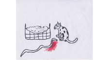 A drawing of the cat-baby-snake scene was made in response to the spoken recounting of the story. The drawing was adapted into the cut-outs pieces, and we discussed the dramatization of the scene: who would see the snake first? The cat, or the baby? How would we show that the cat is caring for the baby? Perhaps the cat could sing a lullaby to show its care? Working with the poet Phil Terry, the refugees devised a lullaby in French, and we decided to attempt to animate the words to the lullaby on the screen. Momadou, who was animating the scene, naturally changed pace and slowed the speed of the sound emitting from the snake, which added more tension to the scene. The refugees discussed how best to write the sounds that a baby makes when it cries, as each language has its own ways of expressing sound as text. When the camera was knocked, we cut in for a close up to disguise the jolt: