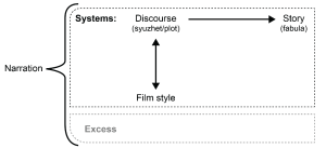 Bordwell (1985, p. 50, 53) highlights the close linkage between style and discourse (syuzhet). Both are strongly involved in the phenomenological process, that is, how the spectator receives the story, but where discourse takes care of the dramaturgical elements, style handles the technical side. Both elements are of course strongly intertwined; for example, discourse space is largely determined by the framing (cinematography) and the mise en scène.