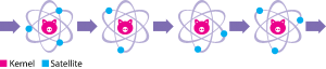 According to Google (Google Spotlight Stories, n.d.), Piggy offers a “new level of interaction between character and audience.” Piggy does actually deviate slightly from the linear succession of events occurring within a fixed duration of time that we are used to in film. If we consider Chatman’s (1978) conceptions of discourse time, Piggy’s order, duration, and frequency will presumably never be identical for two different screenings. In the middle of the film, the staging of actions is influenced by the spectator. Nonetheless, the outcome – that is, the ending – remains the same. This is possible because each event can have either more or less importance in relation to the overall narrative (Chatman 1978, p. 53). Chatman uses the terms kernel and satellite to distinguish narrative events based on their hierarchical status. Events crucial for the narrative progression are called kernels. These are the key events influencing a story’s course of direction. If, in Piggy, the spectator misses the protagonist’s greedy glance at the cake in the beginning, she might not understand his effort to direct her attention. It would, in Chatman’s words, disturb “the logic of the plot” (Chatman 1978, p. 54). But a narrative consisting of only kernels, that is, events that efficiently drive the story causally forward, is likely to appear less rich and vivid. That is why most films are, additionally, filled with events that deviate slightly from the causal advancement. At one moment in Piggy, the protagonist removes the glass dome covering the cake to have a bite. When he senses being watched, he pretends he is cleaning the dome by rubbing it gently. This little gag can be recognised as a satellite; the event is not decisive for understanding the story yet it still orbits around the kernel, because it gives more depth to the pig’s personality and intensifies the comic situation. The figure below illustrates the relationship between kernels and satellites.