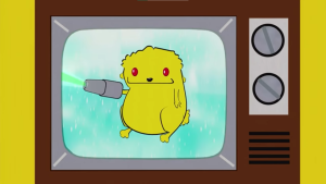 If television’s cognitive bombing of the kids could appear overstated, Kenny’s epileptic attack (and his enduring hypnosis across the episode) explicitly references the so-called “Pokémon shock”. This is the term the Japanese press used to label a case of massive seizures suffered by several hundred children while watching an episode of the Pokémon series on December 17, 1997. This incident led to medical research which compelled Television Tokyo, the Japanese Pokémon broadcaster, to compile a production guideline “in the interest of minimizing the risks of viewer exposure to harmful stimuli”.[iv] Notably, the P-shock news spread before the US Pokémon premiere in 1998, contributing to an explosion of academic and popular Western media fear of the upcoming Japanese TV show.