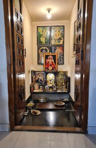 Shloka starts as soon as I finish my bath. I will keep on saying, I do not say I am a good singer or anything but I enjoy telling shlokas. In the puja room only I light the lamp, place flowers. There is no time only, but shlokas I don’t stop. It also helps me concentrate and finish things faster. And my children know. They don’t talk to me until I have stopped reciting. My puja is over only when I do the final namaskara (salutations) in the puja room (see Figure 9)