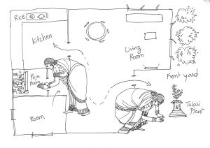 Figure 9. Suma’s morning ritual involves the various parts of the home while chanting hymns including the Hanuman Chalisa.