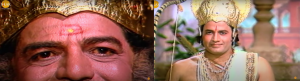 Figures 1 and 2: King Janak looking at prince Ram for the first time accompanied by a song with lines from verse 215 (1.1.215) of the Ramcharitmanas. From episode 6 of Ramayan (1987).