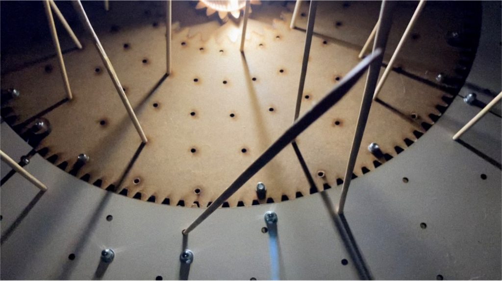 The notion of a ‘machine’, which is featured in the title, is at the center of this piece. All of its parts, even though they have been cared for in aesthetic terms, fulfill a function. They are part of a mechanism that aims to construct a scenic space made up of moving shadows, obtained by intermittently concealing a spotlight by means of slender wooden cylinders inserted into multiple holes in a rotating plate. Spotlight and plate rotate in opposite directions, sharing the same center. The physical limits of the machine are defined by an immovable ring that helps to contain the central plate, which fixes the system of wheels responsible for the movement of the plate and a mechanical switch. This ring also protects the light sensors that are responsible for sending light intensity values to the computer system with each activation of the switch per complete turn of the platter.
