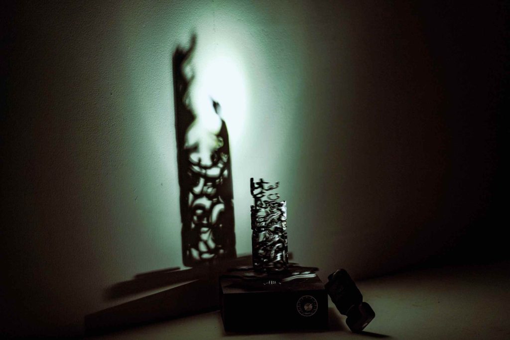 Finally, we regularly participated in exhibitions, usually accompanied by a presentation of our theoretical insights. Throughout these reflective moments, we observed, after a few iterations, that our focus of attention had gradually shifted from the creation of analog animation installations, towards, more specifically, the creation of works that entail an interplay between light and shadow. We noticed that many of our animated works involved the display of a device that casts a moving shadow or a kaleidoscopic light-play on a surface, for instance by placing a strobe light in the middle of a rotating cylindrical object. This led us to rethink our approach to the relationship between animation and memory. We started digging deeper into the question of how a process of dematerialization such as shadow casting can be linked to notions of cultural preservation and cognition. In this effort, we developed a visual style that relied strongly on Arabic and Persian calligraphy. In the next section, we will present our conceptualization of the link between shadow, light, and memory; after which we will discuss a number of the resulting creations and their connection to these theoretical insights.