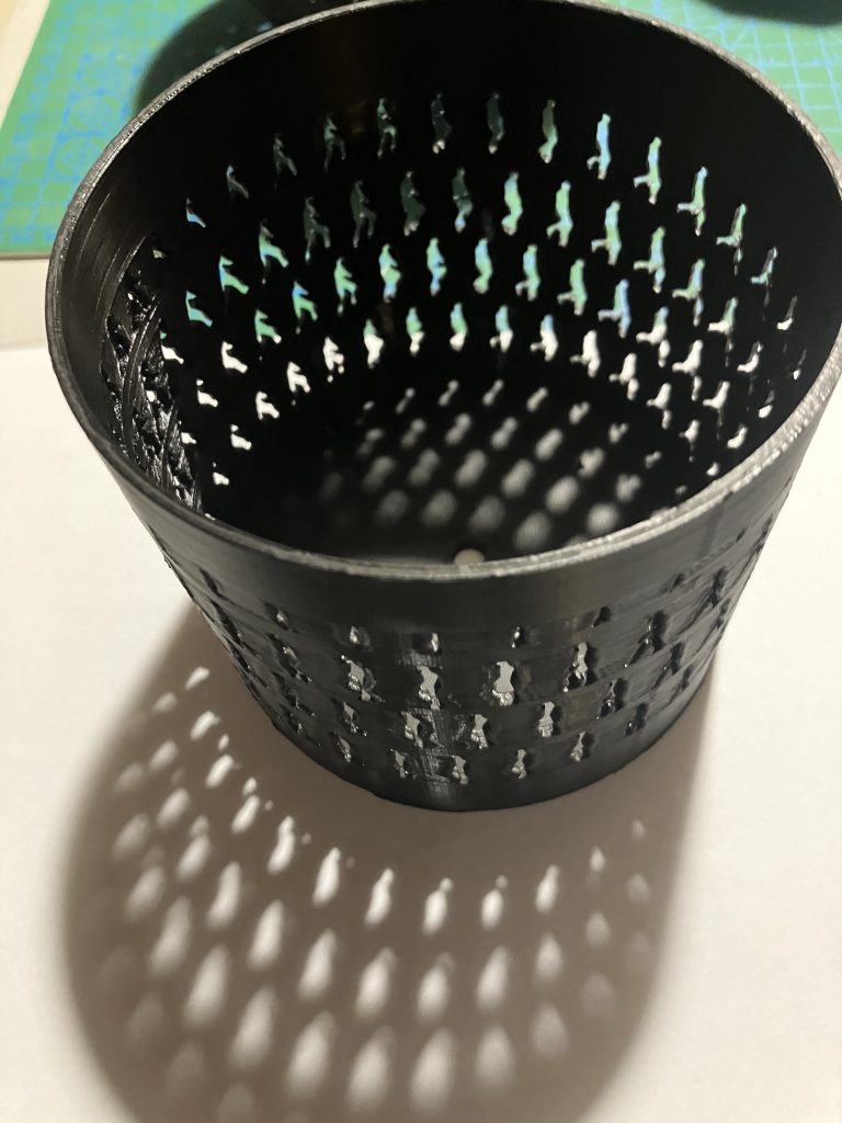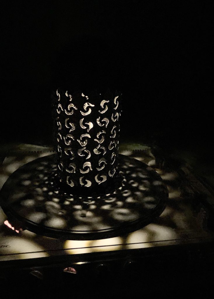 This bowl’s ornamentation depicts a wild goat jumping up to eat the leaves of a tree in a series of images representing the animal’s movement in five stages, in a way that is strikingly reminiscent of zoetropes. Taking inspiration from the bowl, Diaa Lagan organized a range of workshops with graphic art students at Dún Laoghaire Institute of Art, Design and Technology (IADT), exploring the techniques of holey pottering, Arabic calligraphy, and shadow casting. Expanding on these experimentations, the artist then created a visual pattern based on a memory of his personal daily habit of drinking coffee on a balcony at home, in Aleppo (Arabic: تعال, القهوة جاهزة على البلكون; English: come on! coffee is ready on the balcony). At this stage, the work was concerned with the legacy of decorative writing and Arabic calligraphy as an identity practice and form of expression of memories. In the third stage, John Buckley and Diaa Lagan studied the properties of the Dreamachine, a device imagined by Brion Gysin and William S. Burroughs in the 1960s, also reminiscent of the zoetrope. The Dreamachine is a flickering light art device, rotating at a specific speed and frequency (78 rpm speed, light frequency of 20.8 Hz) creating for the user who keeps their eyes closed, a state of relaxation, leading to creative inner visions or hallucinations (ter Meulen, et al. 2009). In order to recreate the Dreamachine properties, the 2D sentence depicting the artist’s past coffee-drinking habit is turned into a three-dimensional object – a cylindrical sculpture. Spinning on a turn-table with a light bulb in the middle, casting dynamic hypnotic shadows in the space as it rotates, the sentence-turned cylinder replicates the original Dreamachine, while at the same time, the routine expression it depicts is now expressed through a repetitive kinetic motion. As the project focuses on hybrid analog and digital animation, we used 3D printing to create prototypes, testing them manually. Through regular online meetings with the Expanded Memories collective, sharing ideas and processes, we found a connection to collaborate with José Neves, by adding elements of the Kalam-Machine to the Shadow Machine. During an online and in-person workshop, we decided to break down the Kalam-machine into separate parts so they could interact with the performative elements of the Shadow Machine. The workshops also allowed us to test various techniques of shadow casting, depending on distance and light intensity, and by overlayering sections of the original Arabic calligraphy.