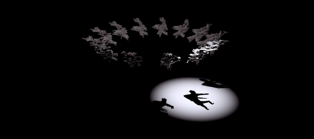 Simultaneous with the creation of artifact 3, another artwork was created that took anamorphic shadow casting as its central focus, in a combination of VR and 3D printing techniques. This installation immerses the audience in a space filled with pulsating shapes visible through a VR headset. These abstract forms constitute an animation loop that seems, at first glance, unrecognizable and unworldly, accompanied by a tense and eerie soundscape. Only as the spectators’ gaze faces the floor do they notice that the casted shadow takes a more conventional, easily recognizable form, unveiling a hunched creature’s walk cycle.