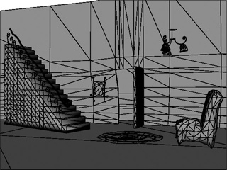 UPA From the late 1940s, United Productions of America (UPA) initiated a new aesthetic direction that was different from the dominant Disney style in animation production. Influenced by the early 20th century modern designs in illustrations and architecture, UPA’s artists developed visual styles by integrating the characteristics of abstraction and simplicity in modern design into their animation productions to compete with Disney’s animations (Klein 1996). Different from Disney’s detailed and realistic-oriented approach, images in UPA’s animation are usually simplified and graphically stylised. I chose Gerald McBoing Boing, UPA’s award winning animated short, as my first visual reference. In this animation, all characters were illustrated in simple shapes with outlines. Environmental backgrounds were simplified by removing lines that display perspective such as horizon or skyline. Space was suggested in the film by articles within the frame. The visual experiment in the 3D environment basically followed UPA’s minimum, suggestive space. The furniture and decoration in the first scene of Gerald McBoing Boing are characterized with curvilinear design. I tried to create models for furniture with similar curved outlines. The idea is to reduce the complexity of characters and background designs to simplify the production process and facilitate an effective expression of ideas. In this experiment, 3D objects are rendered by using toon shading techniques for a flat, graphical appearance with outlines. Many objects are rendered in a white colour to blend into a plain, white background. Figure 1 shows the wireframes of 3D geometry and rendered images, in which only outlines are read.