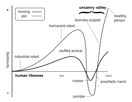 The term is derived from a 1970 paper written by roboticist Masahiro Mori, in which he described the effect and plotted human familiarity on a graph. According to MacDorman and Ishiguro (2006, p. 299), leading researchers in the field, Mori’s assertions that “perceived familiarity increases with human likeness until a point at which subtle deviations from human appearance and behaviour create an unnerving effect” (p. 299). Interestingly, and more appropriate for the field of animation, is that Mori observed an amplification of the effect when movement was added.[2]
