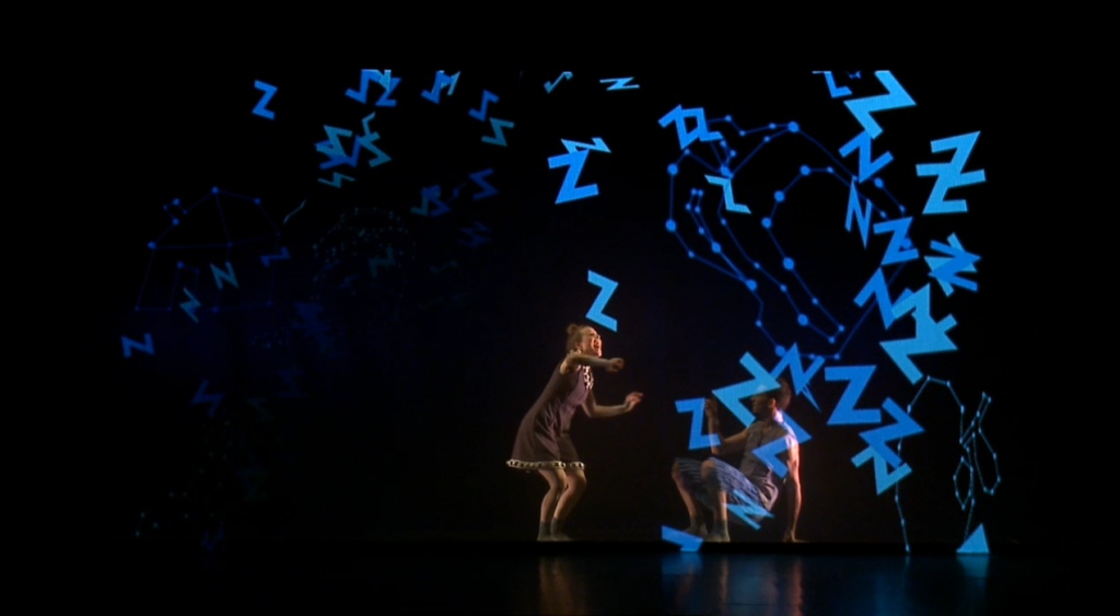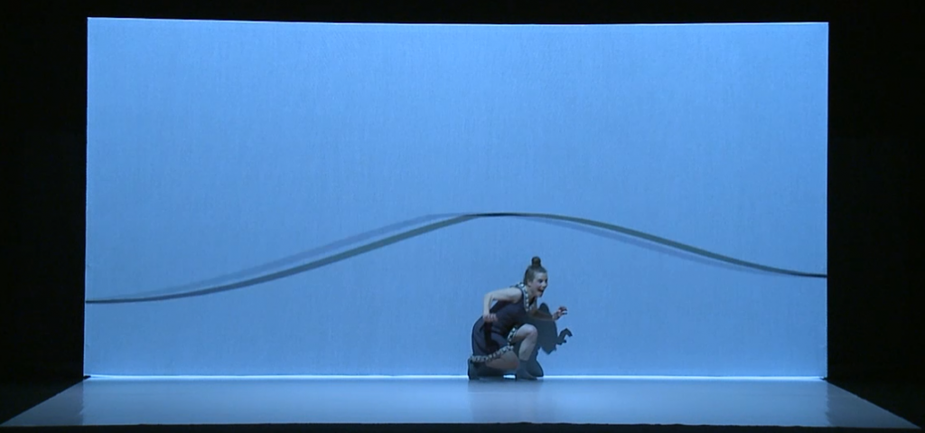 In Laia’s dream moment, she dreams about the objects that obsess her in the play – a whale, a skateboard, an alarm clock. Laia is placed in front of the screen, and the objects leave her head and fall to the ground. Dot interacts with them and whispers his name to Laia. Dot then sneezes, and all the objects hover around, creating an arch above them. The leading characters move this chaotic construction of objects that revolve around them, and as their dance advances, the objects disappear. The use of the silk scrim and the mask tricks used in the animation create an immersive musical experience, in which the objects literally surround the dancers (Figures 7a and 7b).