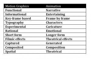 Animation and motion graphics, one option was to tabulate comparative attributes of both fields, many of which have been exaggerated for argument sake and may be easily refuted, however may help us create a framework for discussion (Table 1).